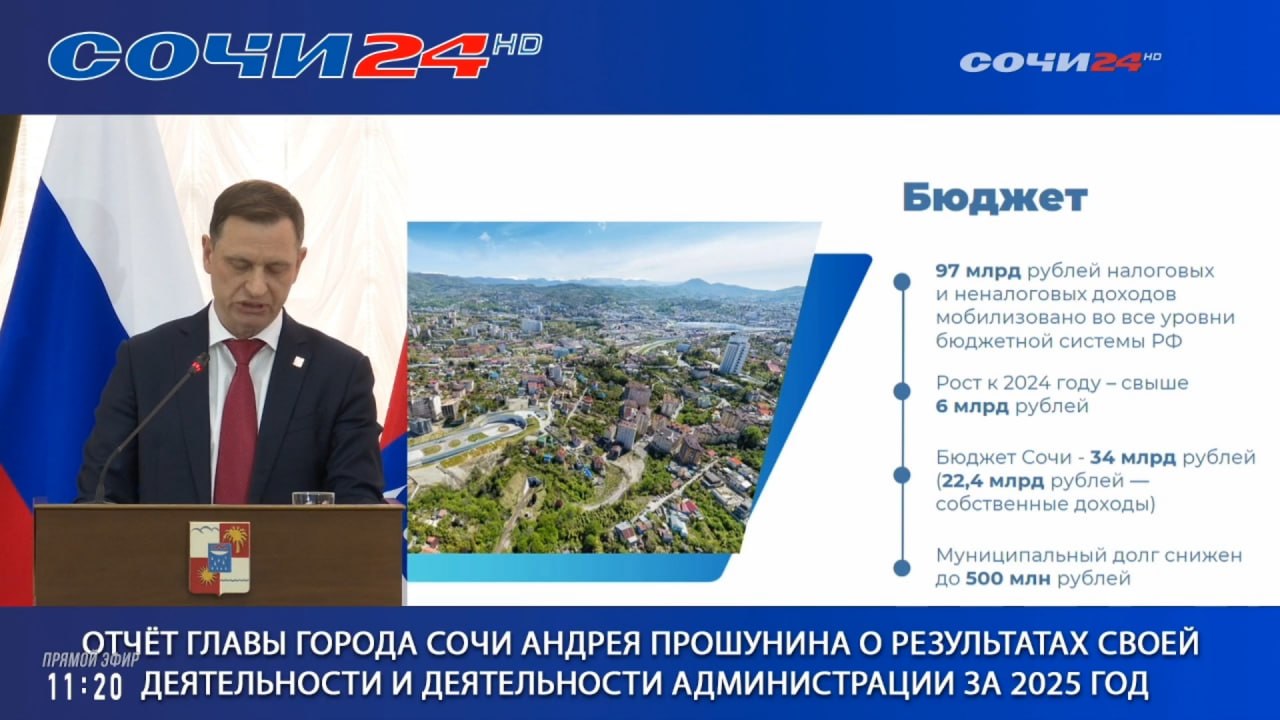 По объёму налогов и неналоговых доходов в консолидированный бюджет края Сочи занял второе место в регионе. Глава города отметил, что бюджет самого курорта за отчётный период составил 34 миллиарда рублей, из которых 22,4 миллиарда — это собственные доходы города. Он также подчеркнул, что удалось сохранить низкую долговую нагрузку: муниципальный долг снижен до 500 миллионов рублей, а кредитный рейтинг Сочи находится на плюсовом уровне со стабильным прогнозом. По словам Прошунина, более 60% всех расходов города, а именно 18,5 миллиарда рублей, направлено на образование, культуру, спорт, молодёжную политику и социальные льготы для жителей.