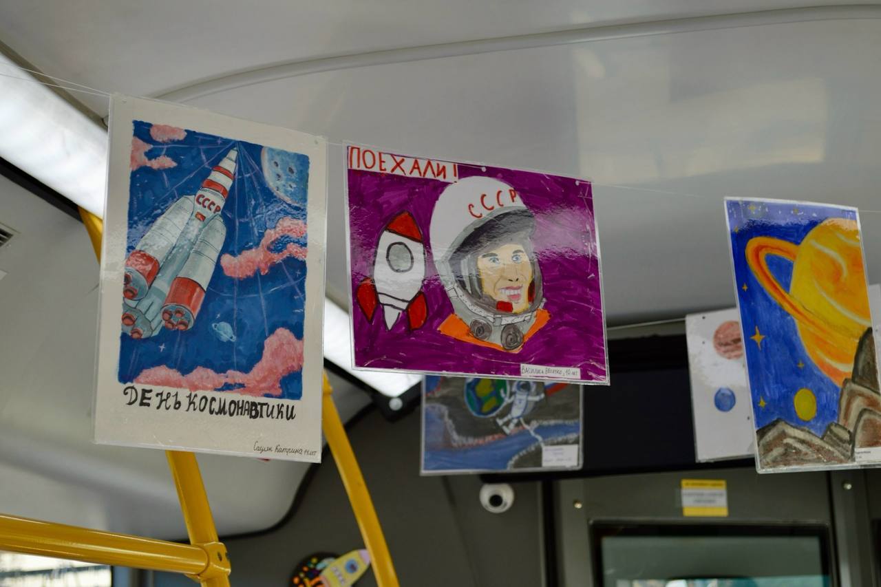 Благодаря такому формату поездки горожане и гости города могут не только добраться до нужной точки, но и узнать больше о страницах истории Сочи, связанных с космосом. Внутри автобус украшен детскими рисунками о космосе.
