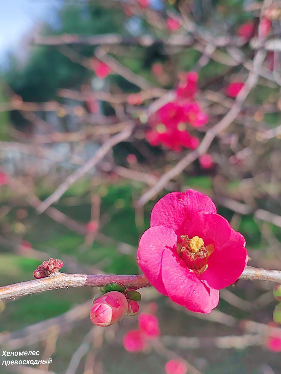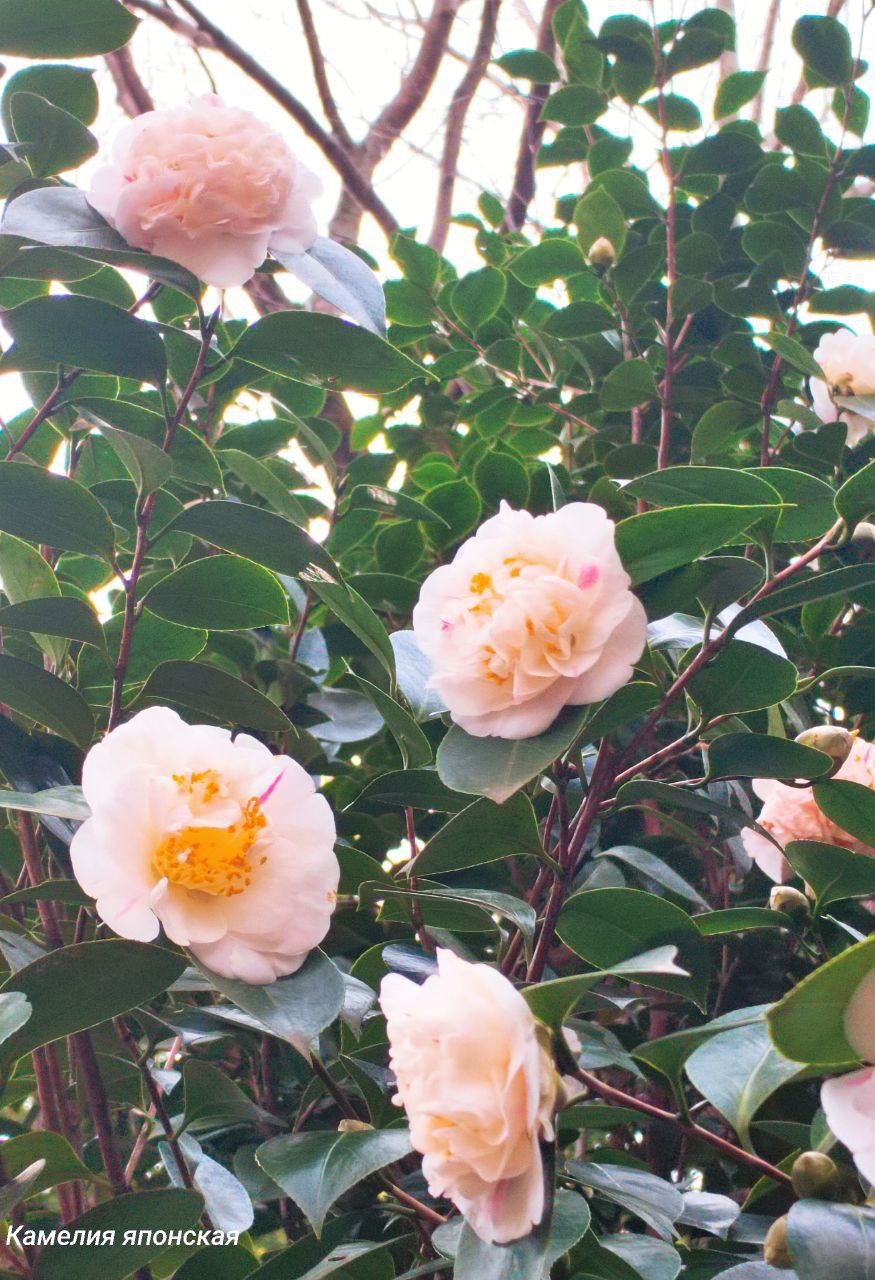 В дендропарке «Южные культуры» в Сочи уже ощущается предвестие весны. Здесь расцвёл ещё один сорт японской камелии, а следом за ними начинают раскрываться бутоны хеномелесы и появляются самые ранние цветы.
