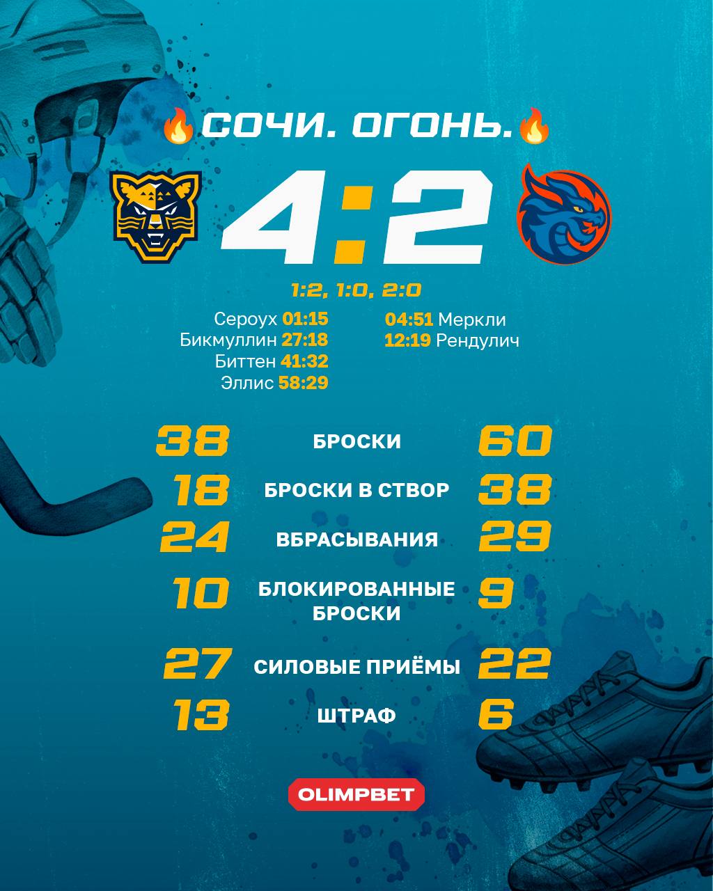 В субботу, 15 ноября, хоккейный клуб «Сочи» одержал уверенную домашнюю победу над китайской командой «Драконы». Матч в рамках чемпионата КХЛ, состоявшийся в ледовом дворце «Большой» в Сириусе, завершился со счетом 4:2 в пользу «леопардов».