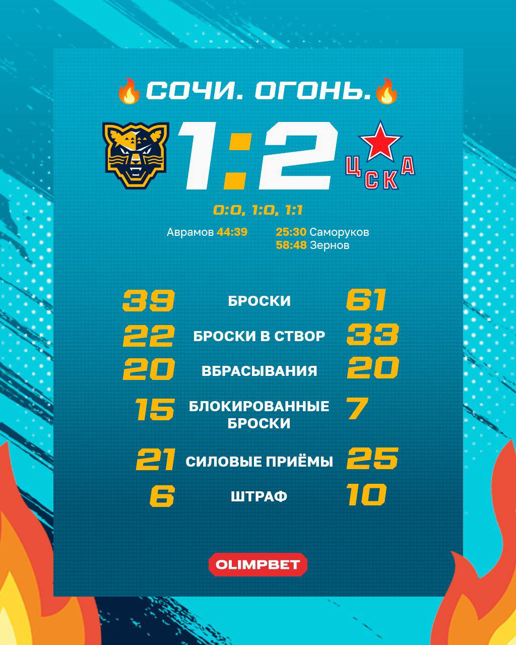 Игра без нарушений держалась почти до финала, но двухминутный штраф Николая Полякова в третьем периоде все изменил. «Сочи» героически оборонялся почти две минуты, однако за 25 секунд до окончания штрафа армейцы все же продавили оборону и вышли вперед. В довершение всего, в момент взятия ворот Василий Мачулин заработал еще одно удаление, и финальный отрезок команда доигрывала втроем против четверых соперников, так и не получив шанса на штурм ворот Гамзина.