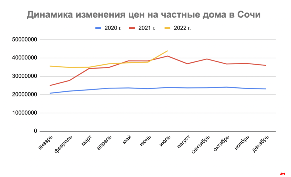 А вот за 2 года – с июня 2020 года по июль 2022 года – средняя стоимость домов в Сочи выросла на 84,25%. В абсолютных значениях дома в Сочи подорожали за указанный период на 20,07 млн рублей.