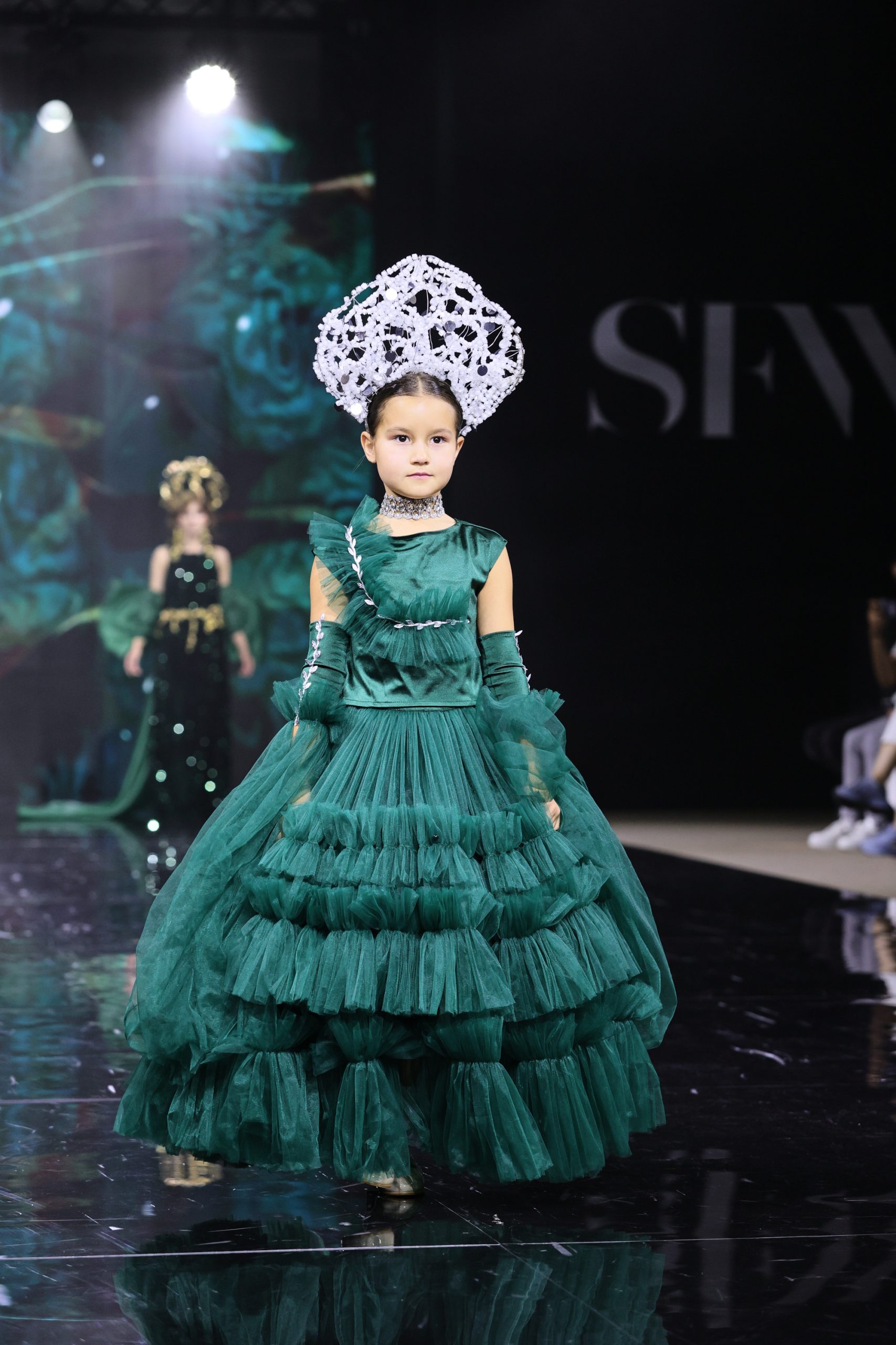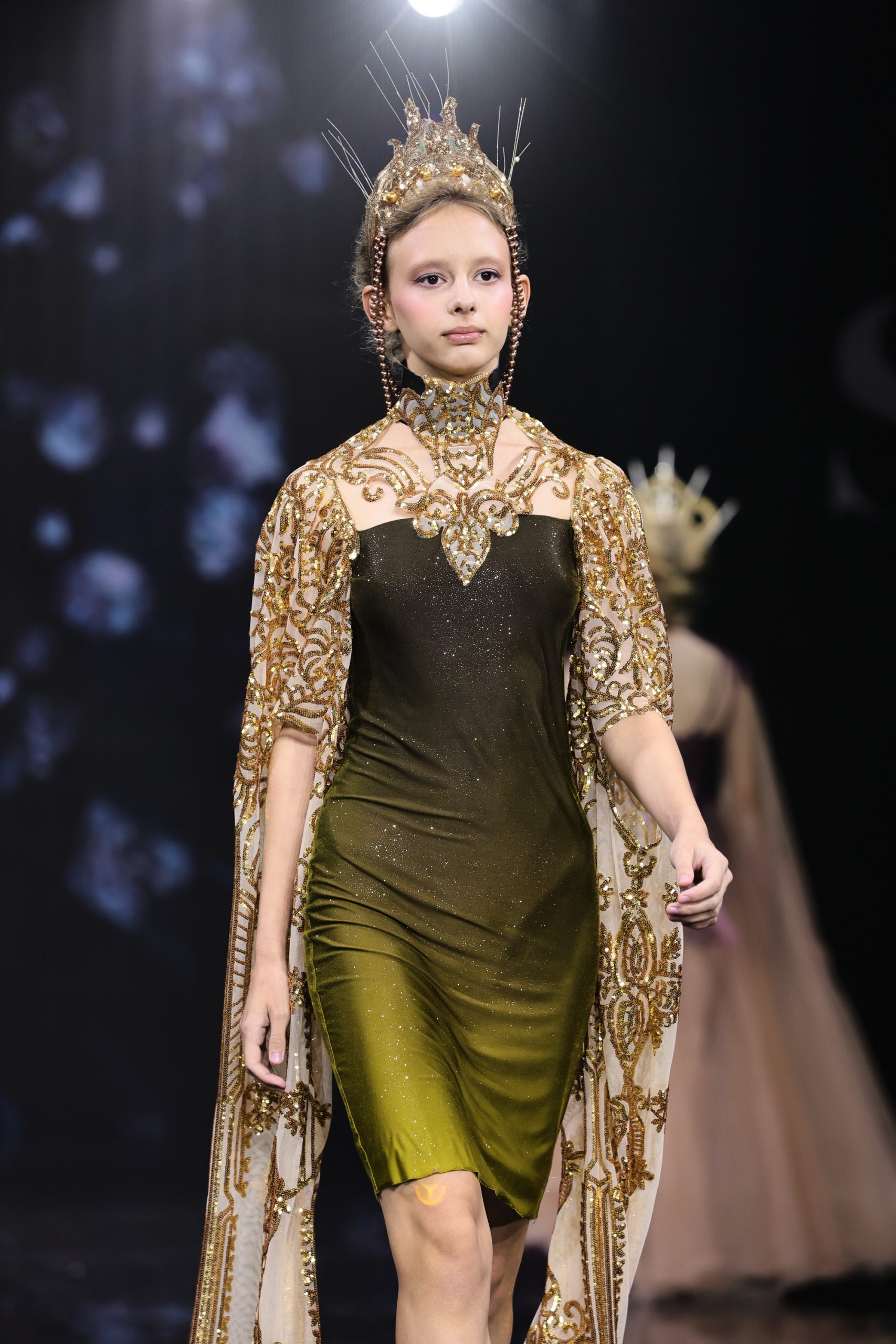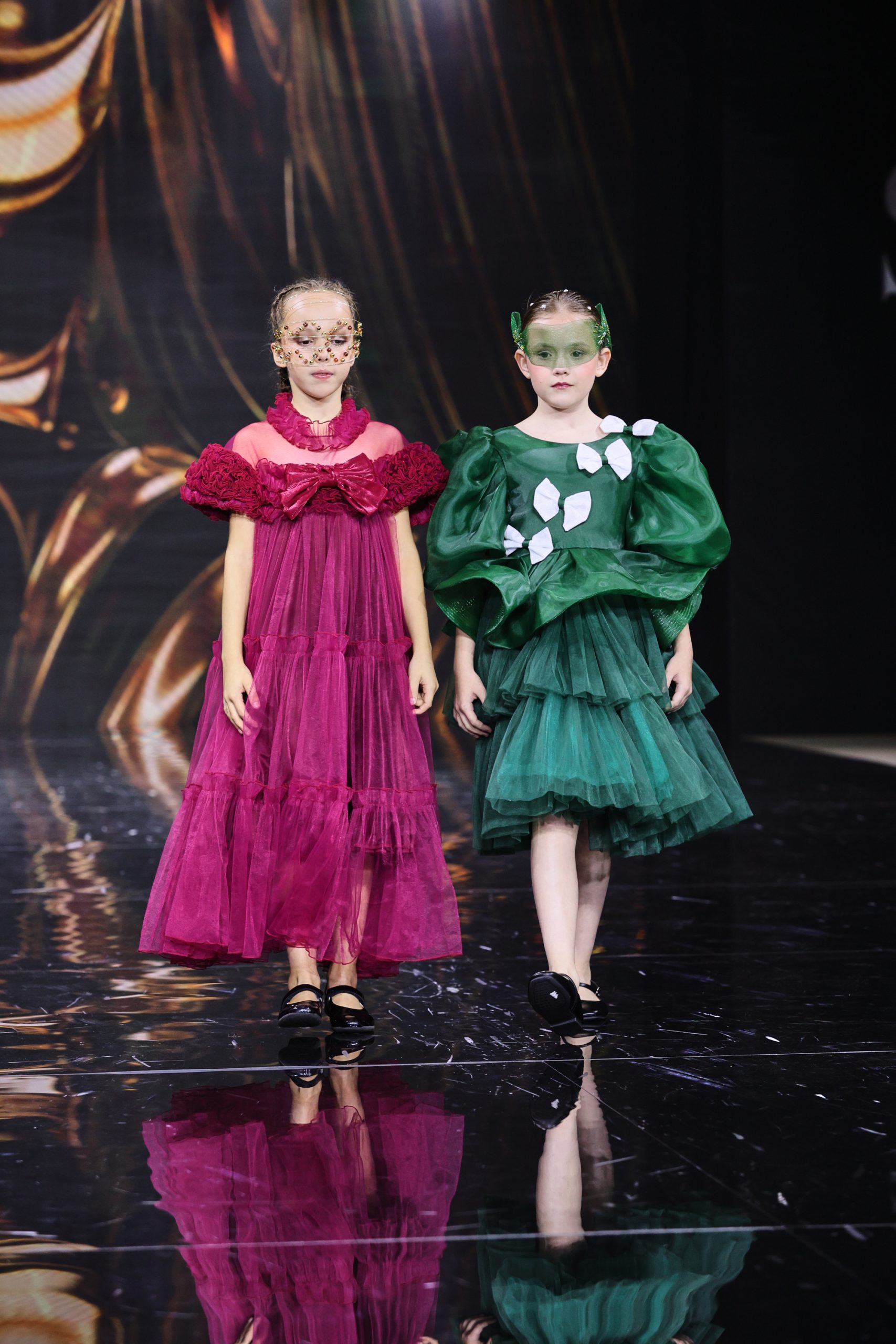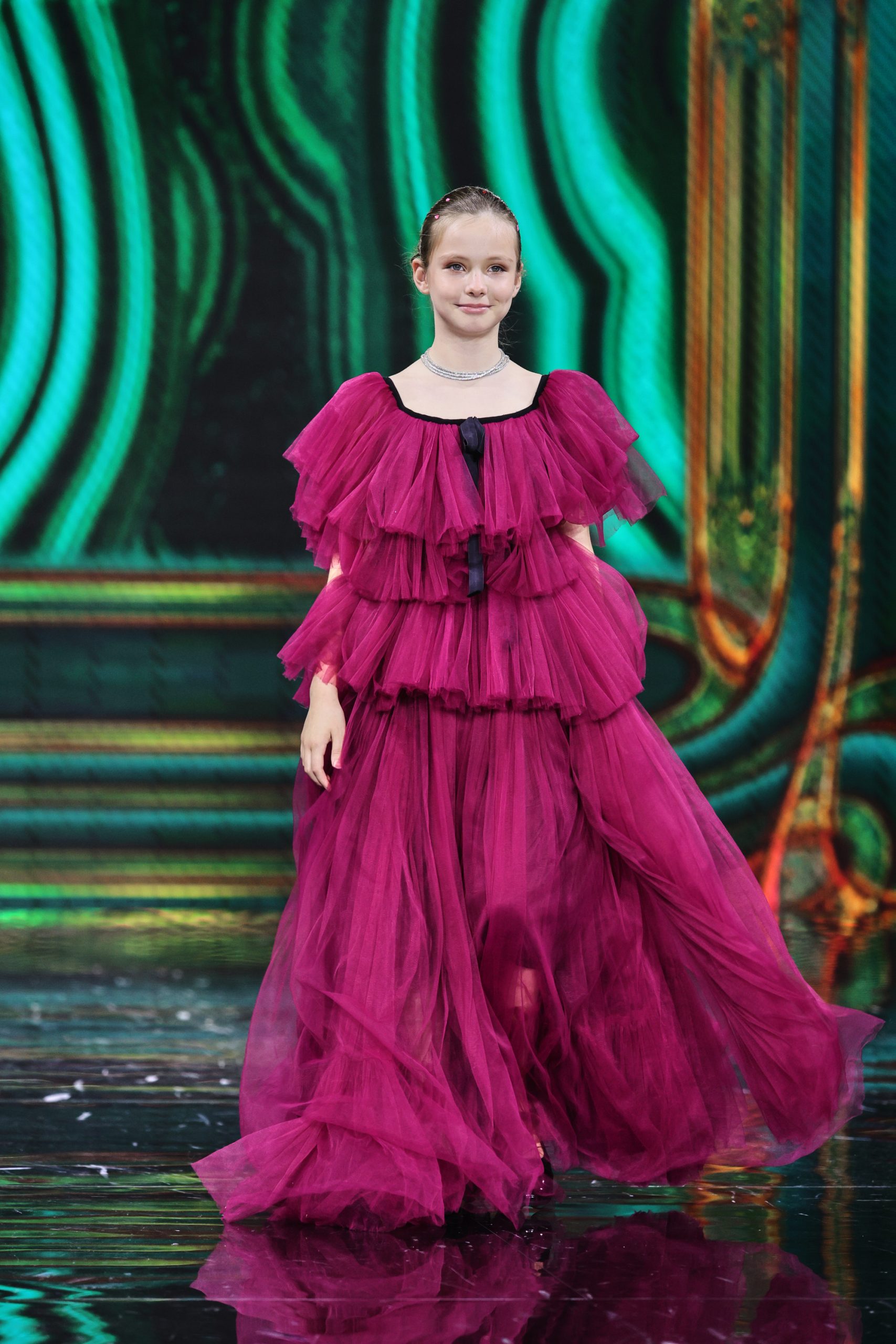 Дизайнер создала вечерние платья для юных девочек, девушек и женщин, в которых явно нельзя остаться незамеченными. Цветовая палитра включает доминирующий зеленый — от глубоких до ярких оттенков, символизирующий гармонию и жизнь, а также малиновый в качестве яркого контраста, добавляющего образам выразительность и драматизм.