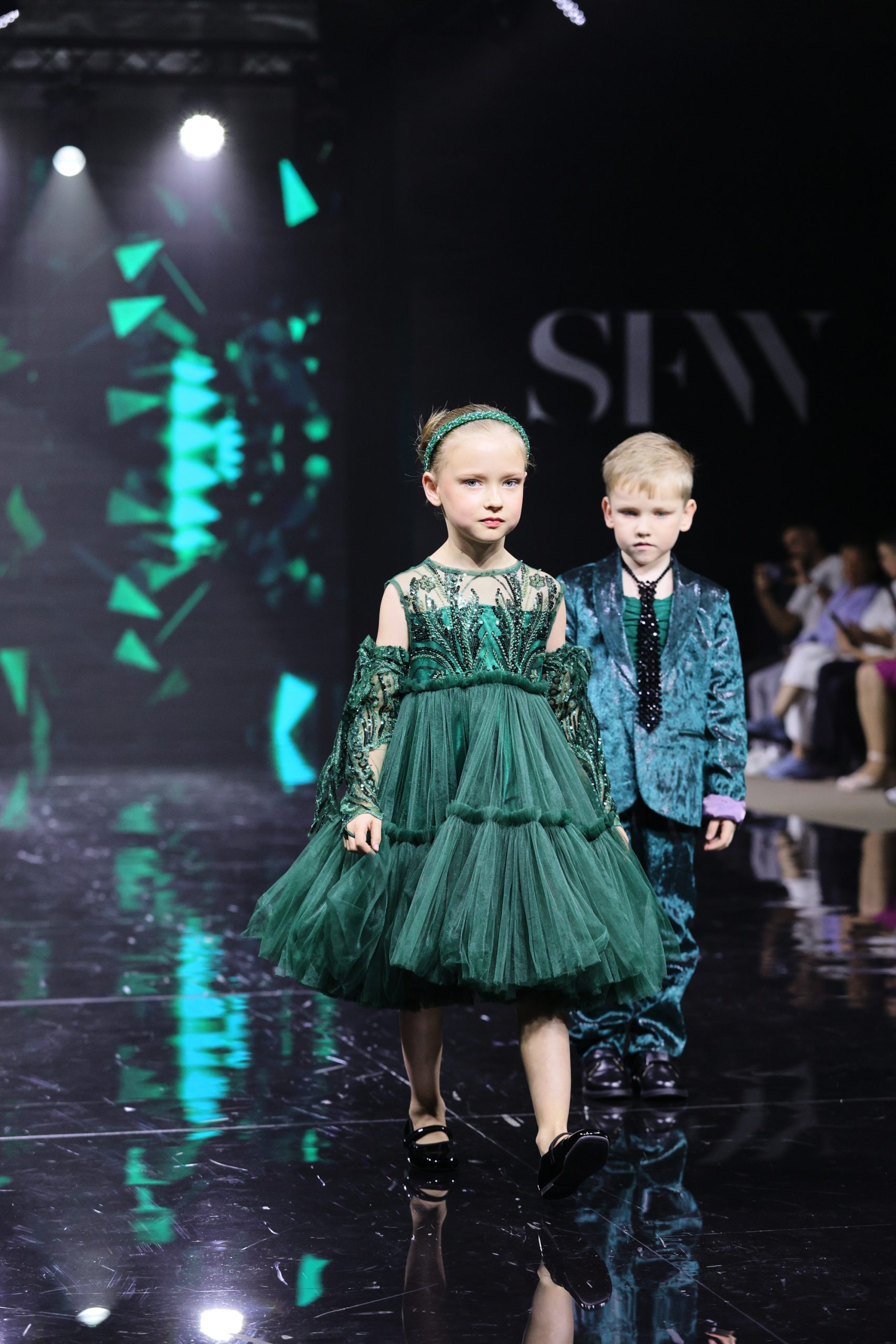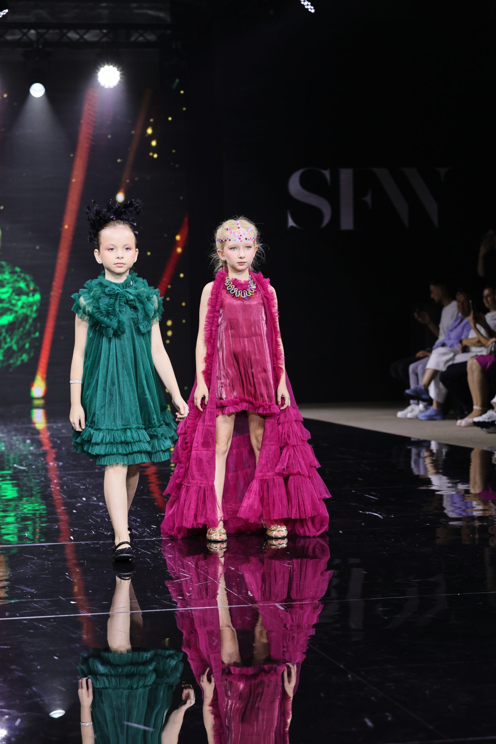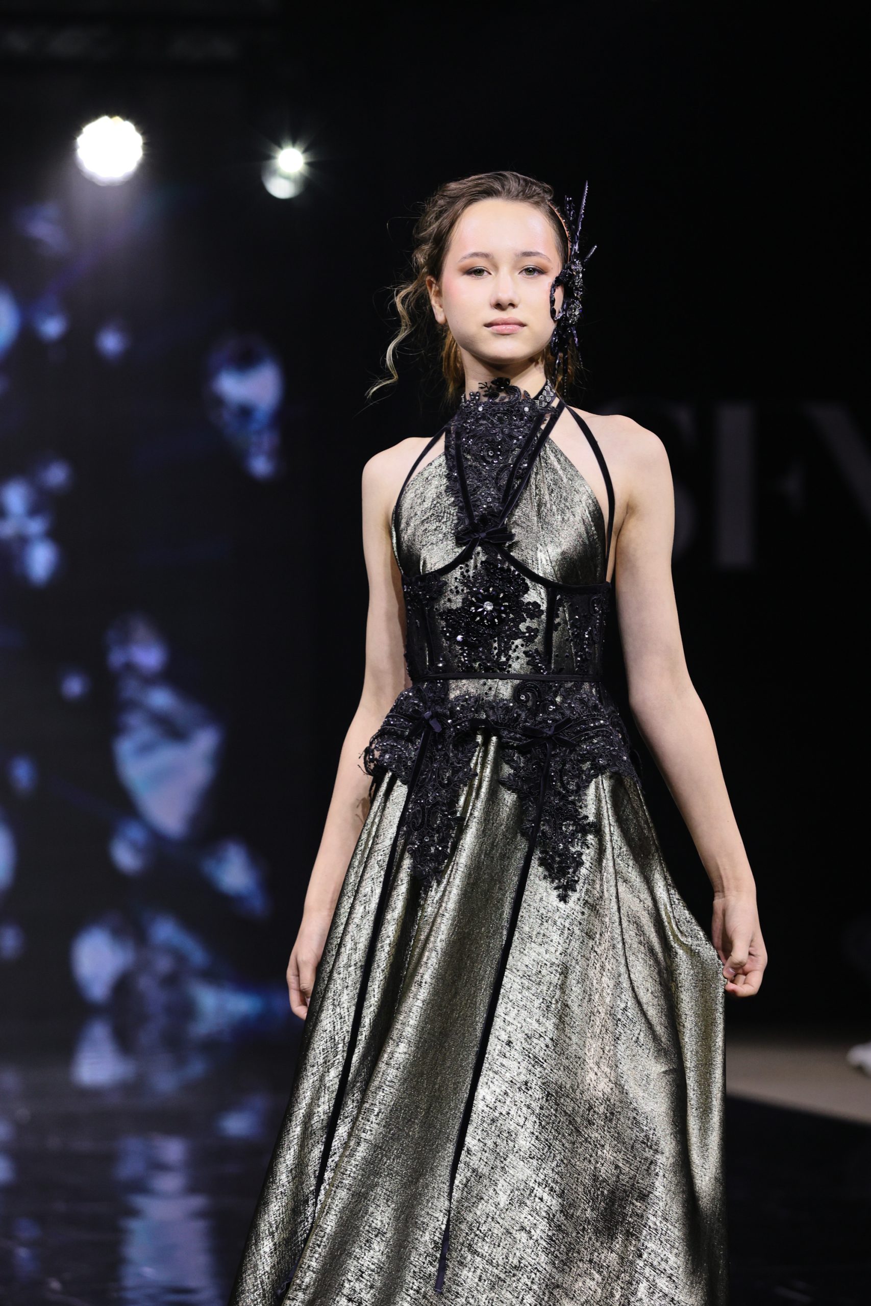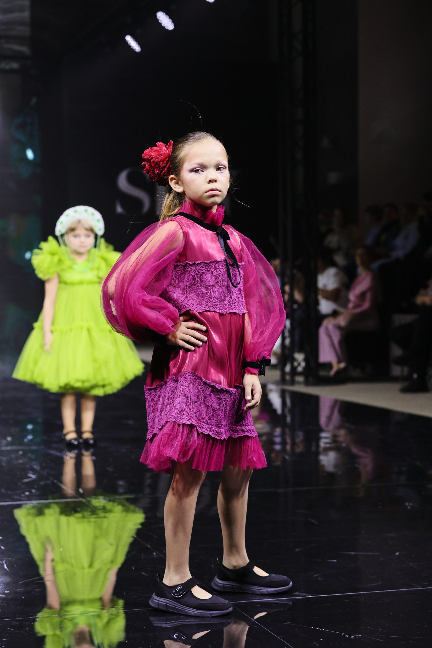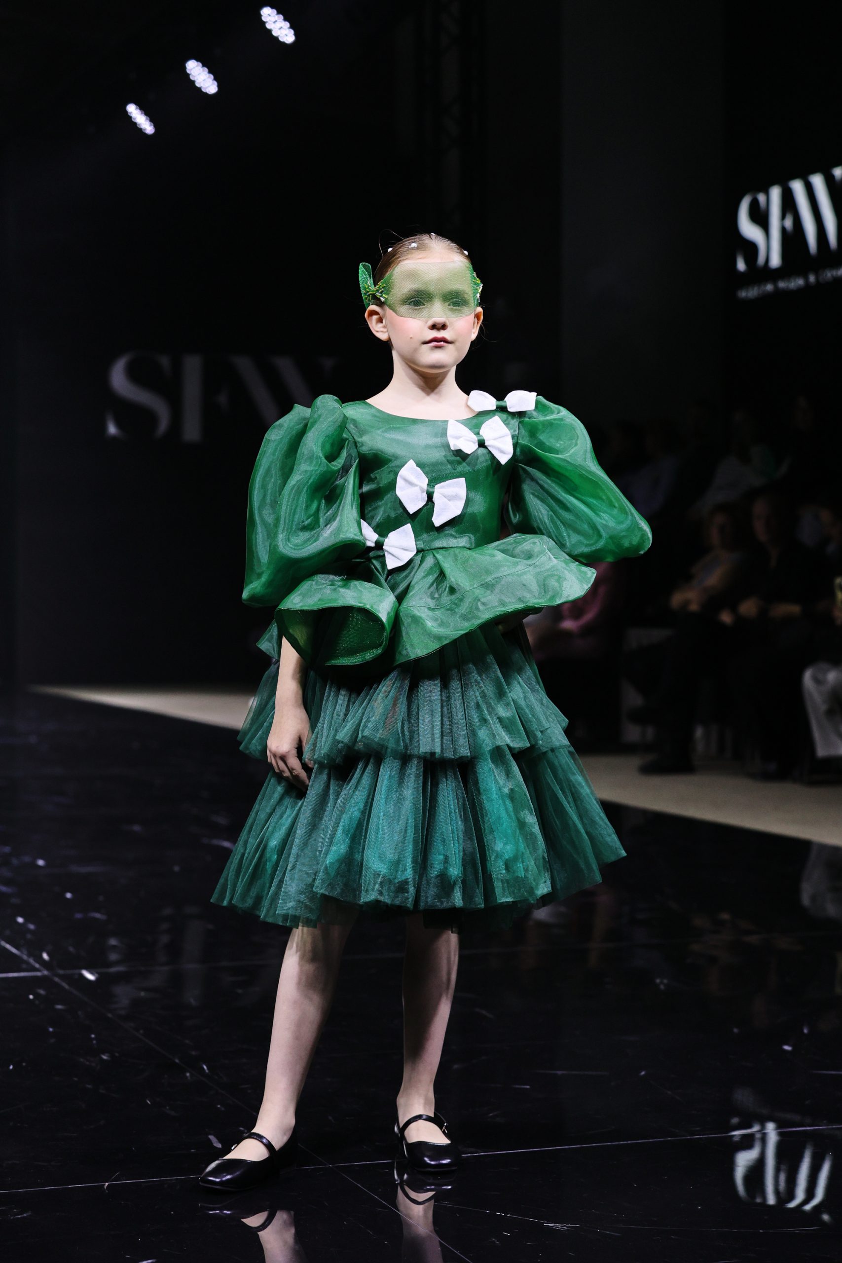 Дизайнер создала вечерние платья для юных девочек, девушек и женщин, в которых явно нельзя остаться незамеченными. Цветовая палитра включает доминирующий зеленый — от глубоких до ярких оттенков, символизирующий гармонию и жизнь, а также малиновый в качестве яркого контраста, добавляющего образам выразительность и драматизм.