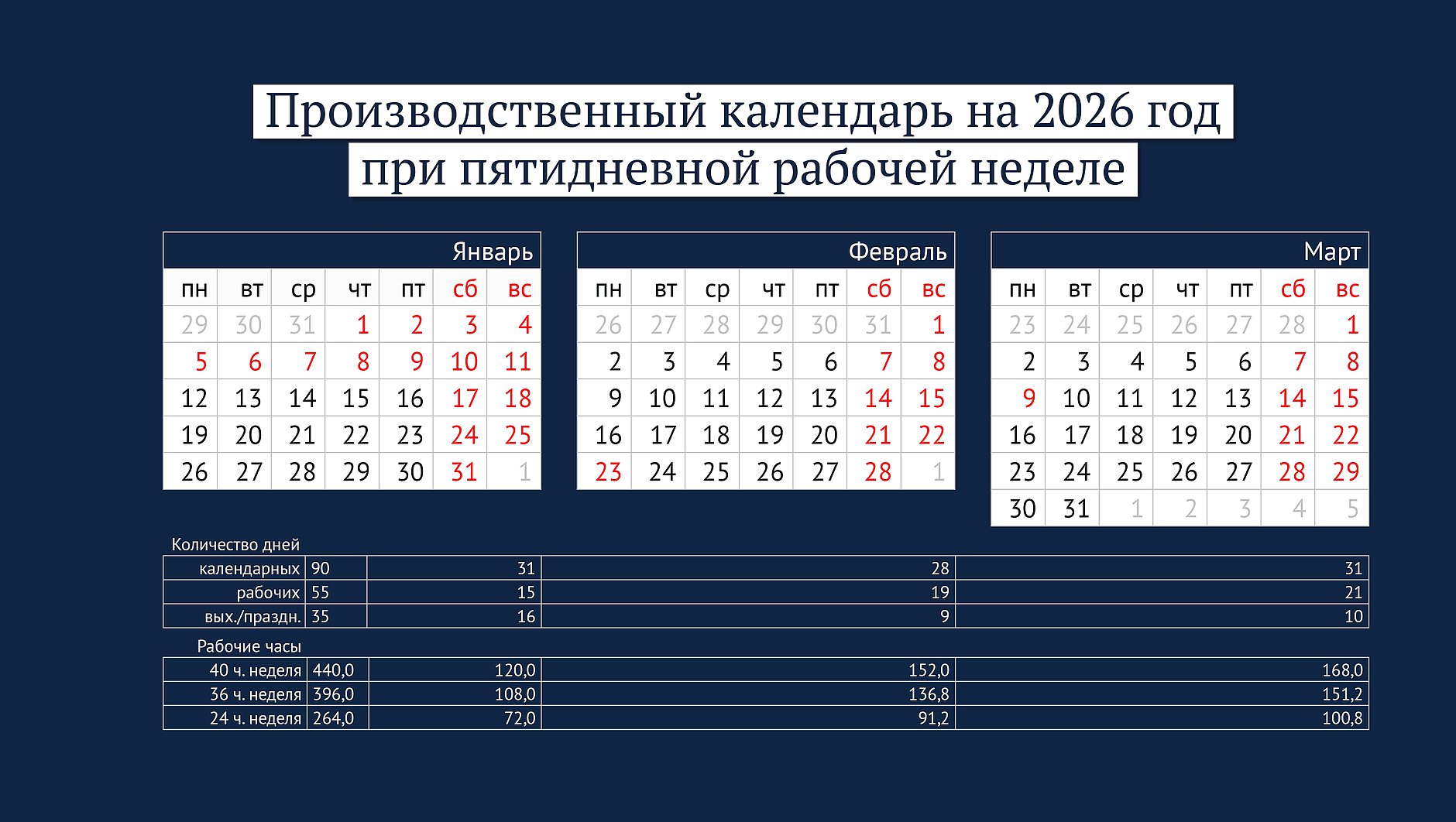 В целом при пятидневной рабочей неделе в 2026 году предусмотрено 247 рабочих дней, включая четыре сокращенных на один час, и 118 выходных и праздничных дней. Норма рабочего времени составит при 40-часовой неделе 1 972 часа, при 36-часовой — 1 774,4 часа, при 24-часовой — 1 181,6 часа.