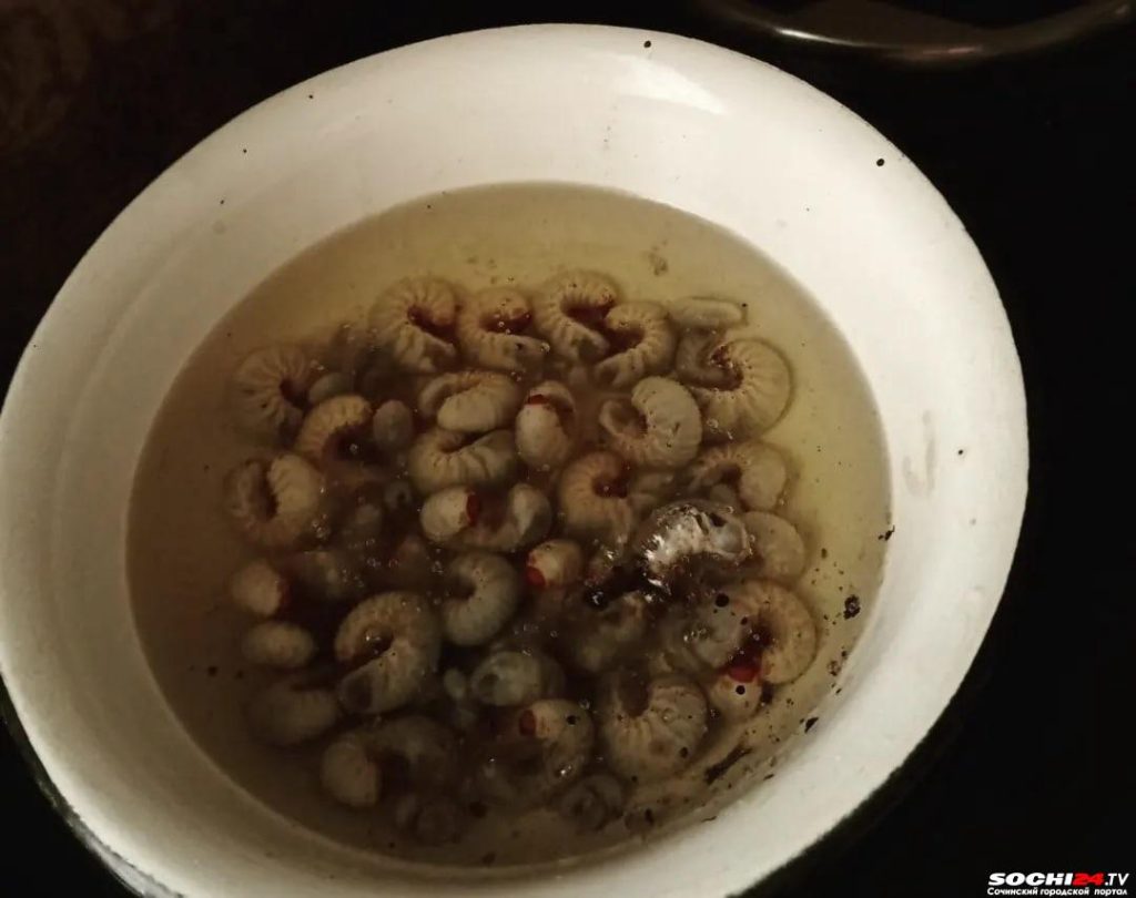 Между тем сочинец нашел свой способ борьбы насекомыми. Речь идет не о пальмовом бурильщике, а о пальмовом долгоносике, который причиняет не меньший вред главному символу курорта. Мужчина поясняет, что, допустим, для Китая вообще не существует такой проблемы, как нашествие медуз или саранчи. Они все это пускают в дело — в еду.