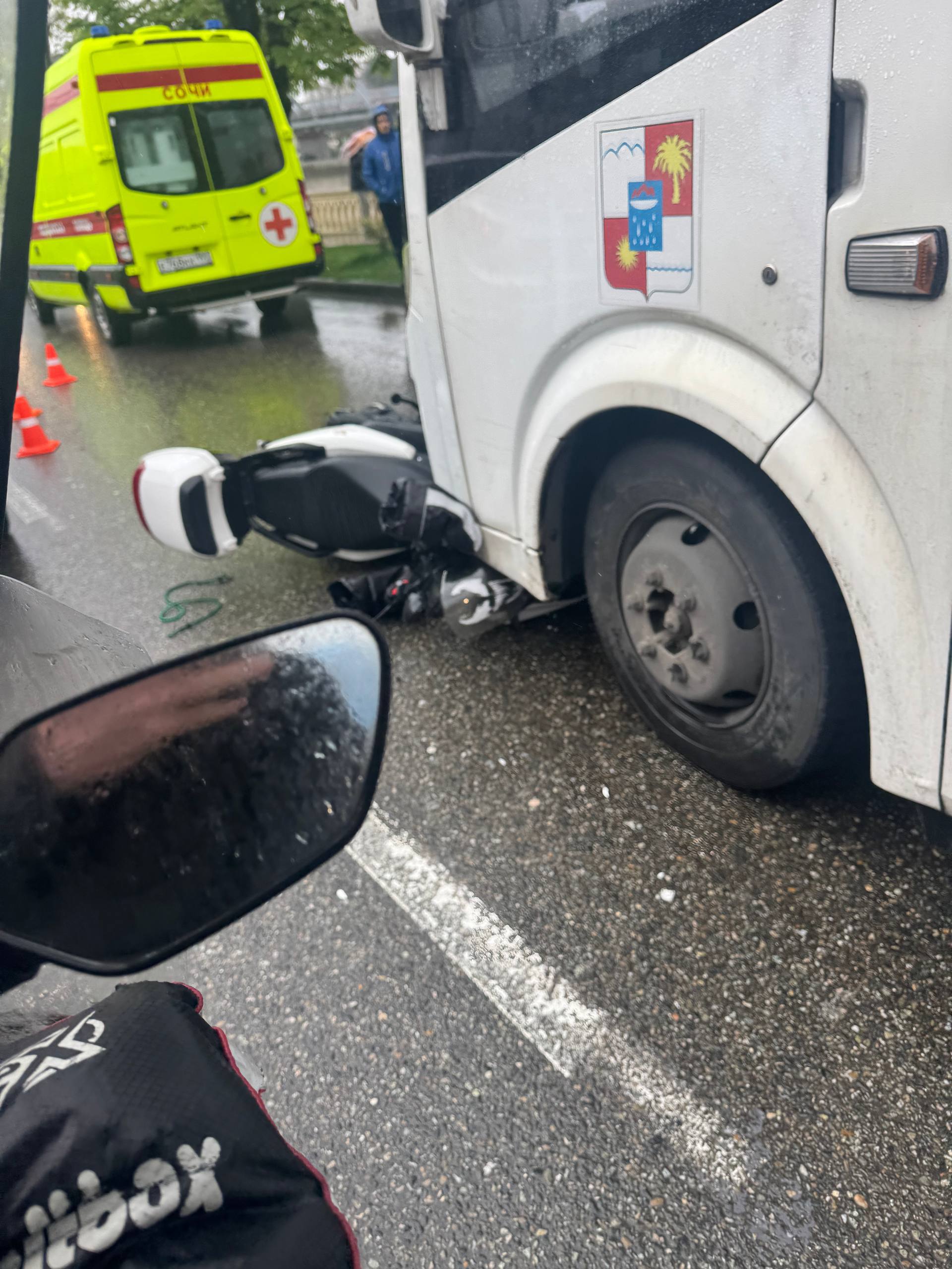 Утром в субботу, 4 апреля, в центре Сочи на улице Конституции СССР в районе остановки общественного транспорта «ЦАРМ» произошло дорожно-транспортное происшествие с участием маршрутного автобуса и мопеда. Как сообщают очевидцы в социальных сетях, транспортные средства не поделили дорогу, в результате чего произошло столкновение.