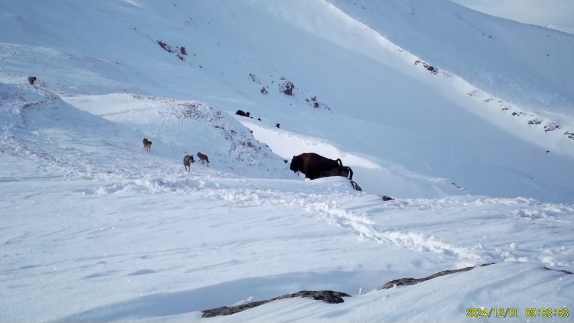 На видеозаписи видно, как зубры переходят к активной обороне. Животные опускают головы, совершают выпады в сторону хищников, а взрослые особи прикрывают молодняк, используя элементы пассивной защиты. Опытные волки, понимая бесперспективность атаки, не вступают в конфликт и спокойно проходят мимо стада. Молодые хищники, напротив, проявляют интерес и пытаются приблизиться, однако быстро отказываются от своих попыток, ориентируясь на поведение взрослых.