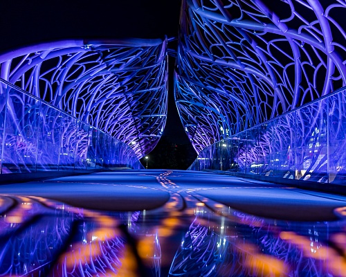 Его световое оформление, имитирующее прожилки листа, создаёт ощущение внутреннего свечения и подчёркивает лёгкость конструкции. Освещение способно реагировать на движение, а также меняет сценарии в зависимости от времени года и проводимых мероприятий.