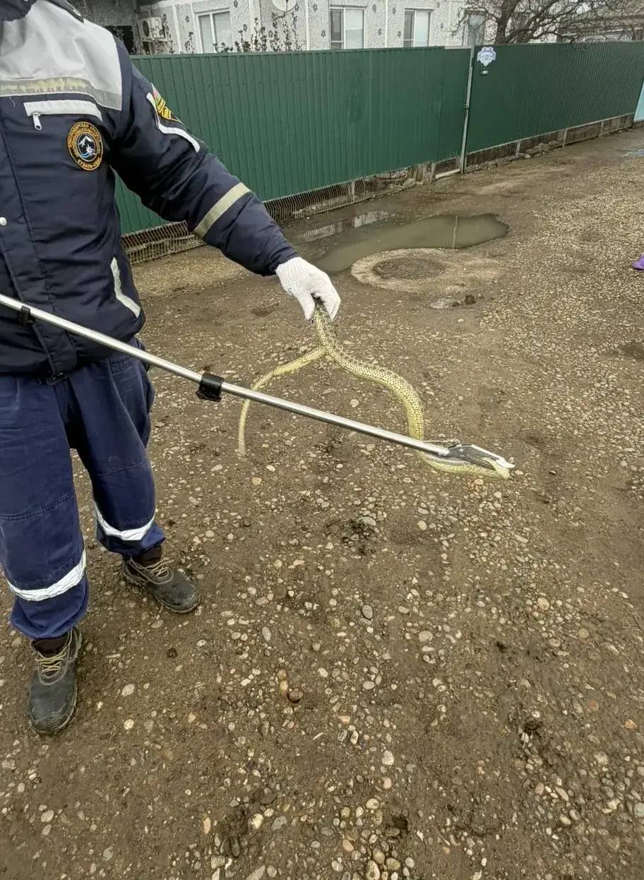 Еще один случай зафиксирован в станице Отрадной. Сотрудники аварийно-спасательного отряда оперативно прибыли на место, изъяли змею и вывезли ее в лесополосу.