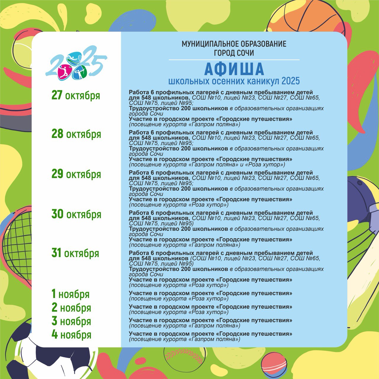 Как сообщается, каникулы продлятся с 27 октября по 4 ноября. В это время для ребят организованы десятки событий: туристические походы, экскурсии, творческие фестивали и спортивные соревнования. Часть активностей будет приурочена к празднованию Дня народного единства. Также в каникулярный период продолжат работу кружки и секции, а для старшеклассников пройдут занятия по подготовке к олимпиадам.