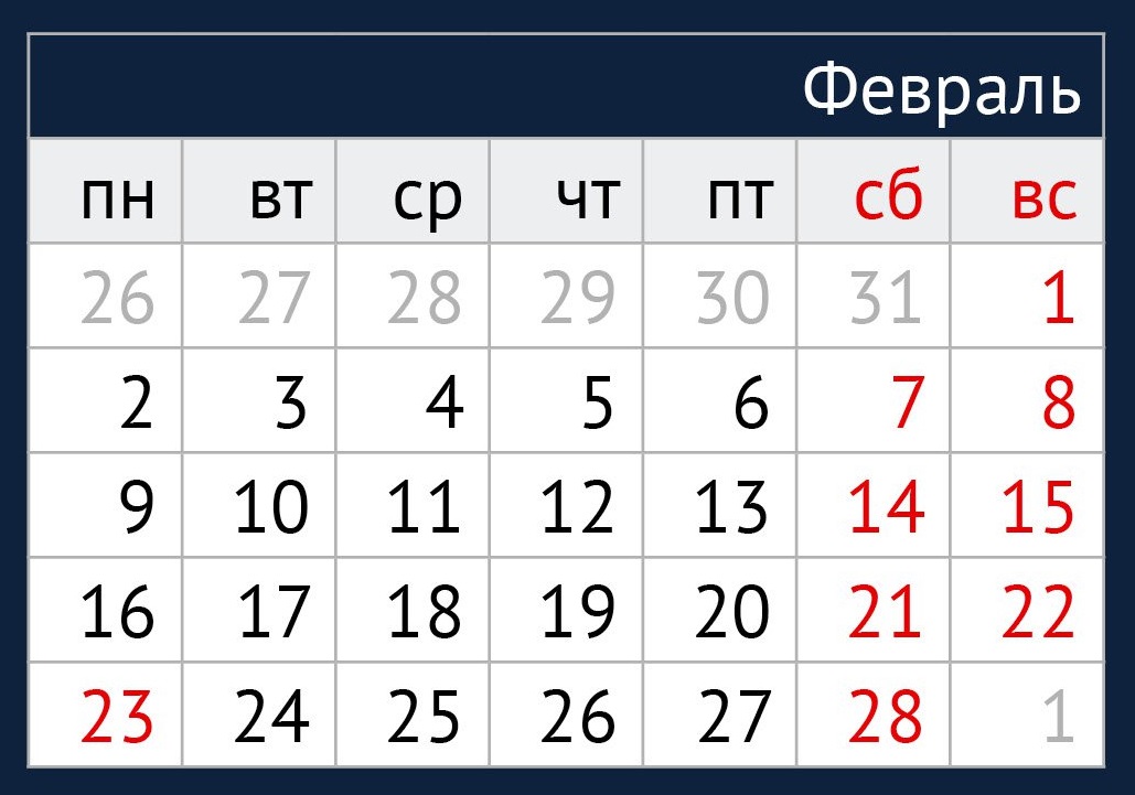 После праздников рабочая неделя будет короче обычной. Трудовые дни придутся на период с 24 по 27 февраля и составят четыре дня.