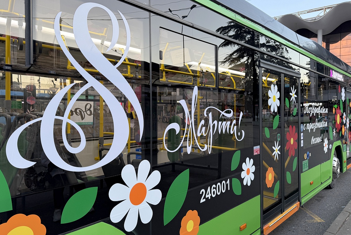 В Международный женский день в Сочи стартовала традиционная акция на общественном транспорте. Утром на линию в Центральном районе вышел электробус, украшенный в стиле весеннего праздника. Его маршрут проходит по кольцу: от остановки «Почта» на улице Макаренко через Донскую, Виноградную и Железнодорожный вокзал, после чего машина возвращается обратно.