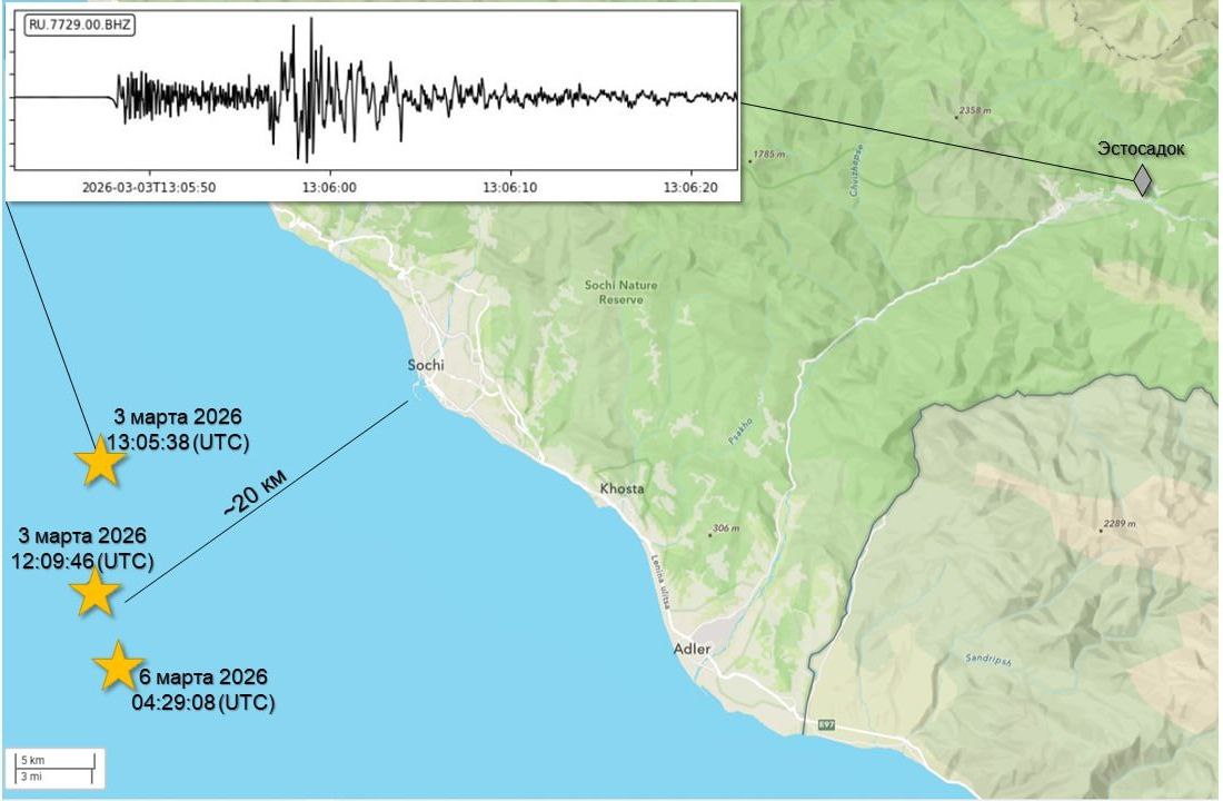 В акватории Черного моря в 20–30 километрах от Сочи 3 и 6 марта 2026 года зафиксирована серия из трех землетрясений магнитудой 4,4–4,5. Разрушений не произошло, однако подземные толчки ощутили жители Сочи и федеральной территории «Сириус».