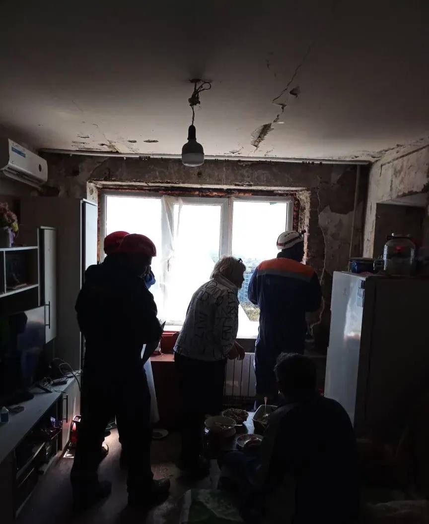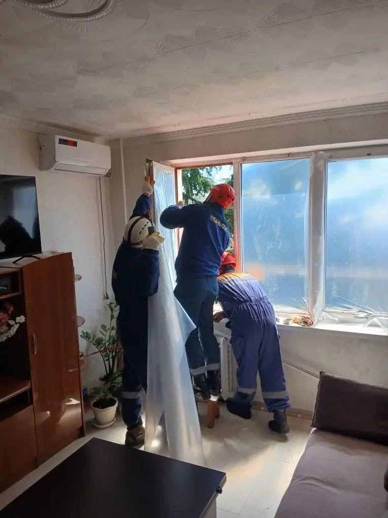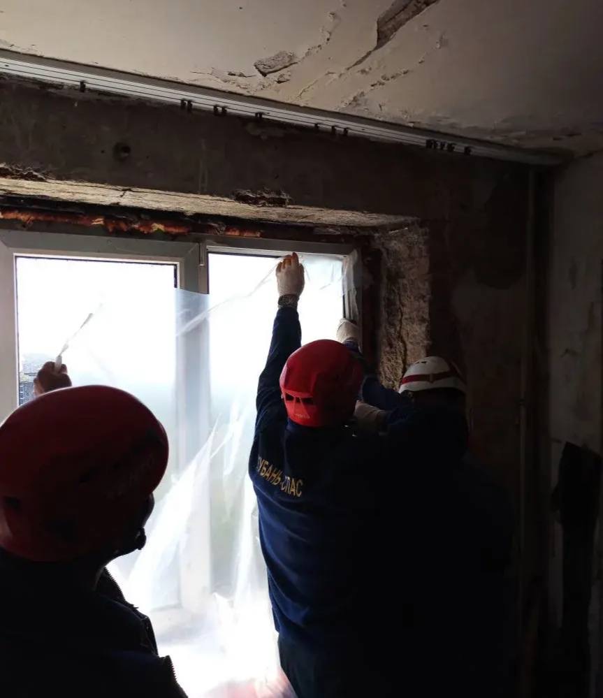 Специалисты помогают жильцам повреждённых квартир. Они изолируют разбитые окна, закрывая проёмы специальной пленкой до замены стеклопакетов. Также спасатели занимаются расчисткой территории.