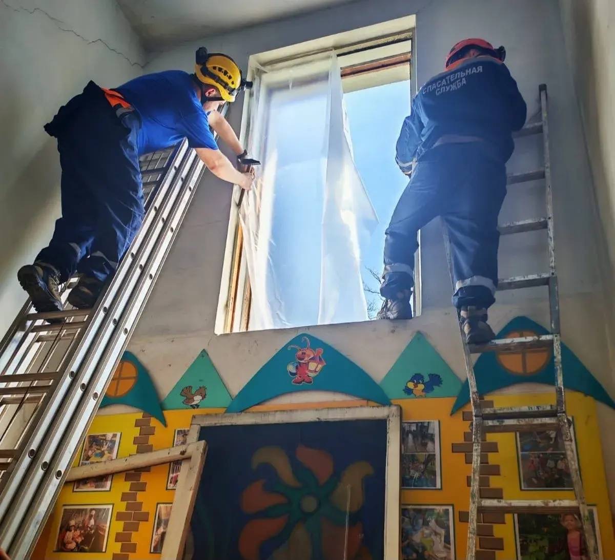 Из-за прогнозируемых ливневых дождей 22 апреля работы окна закрывают пленкой в усиленном темпе. Начальные классы школы № 6 временно переведены в основное здание на улице Ленина в целях безопасности.