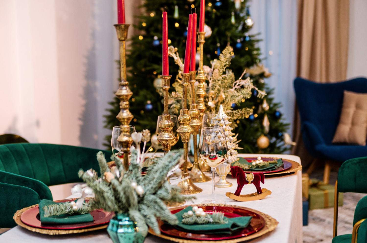 - Элегантно сервированный праздничный стол. В качестве примера предлагаем вам создать композицию из красных гранатов, золотистых груш и зеленого эвкалипта. На первом плане — красивое блюдо с запеченным лососем в апельсиновом соусе (красный-оранжевый) и яркий салат с авокадо и рукколой (зеленый). Фарфор белый или кремовый, акценты золота в посуде и подсвечниках.