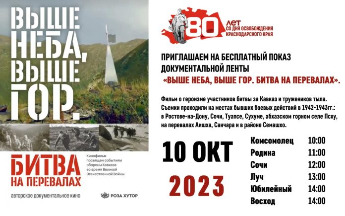 Документальную ленту Дмитрия Кузьмина «Выше неба, выше гор. Битва на перевалах» — о Битве за Кавказ – продемонстрируют в школах, муниципальных кинотеатрах Сочи, Сочинском Государственном Университете.