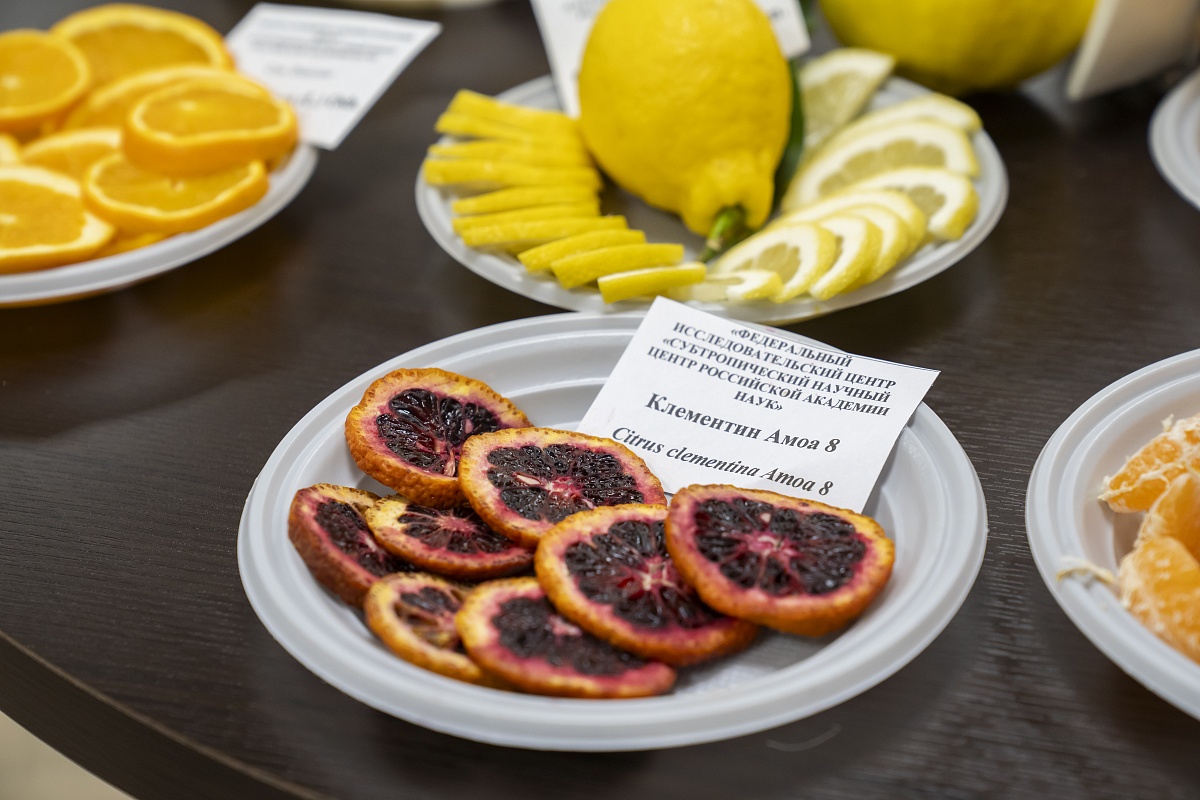 Специалисты крупнейшего профильного центра на юге России показали гостям около шестидесяти сортообразцов цитрусовых. Среди них есть растения, выведенные непосредственно в Субтропическом научном центре РАН и в Ботаническом саду «Дерево Дружбы». Общая коллекция центра признана самой большой в стране. Она насчитывает сто пятьдесят сортов, а гибридный фонд превышает тысячу двести форм.
