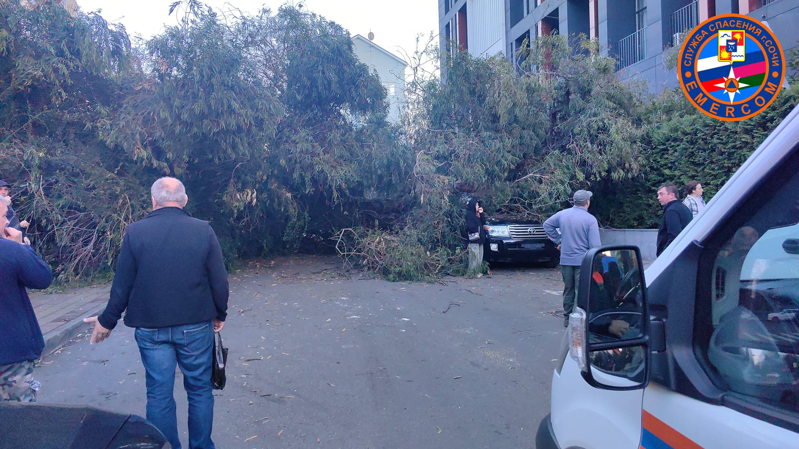 Крупное дерево упало в Сочи на несколько припаркованных автомобилей и перекрыло движение. ЧП произошло вечером 18 ноября на улице Бытха.