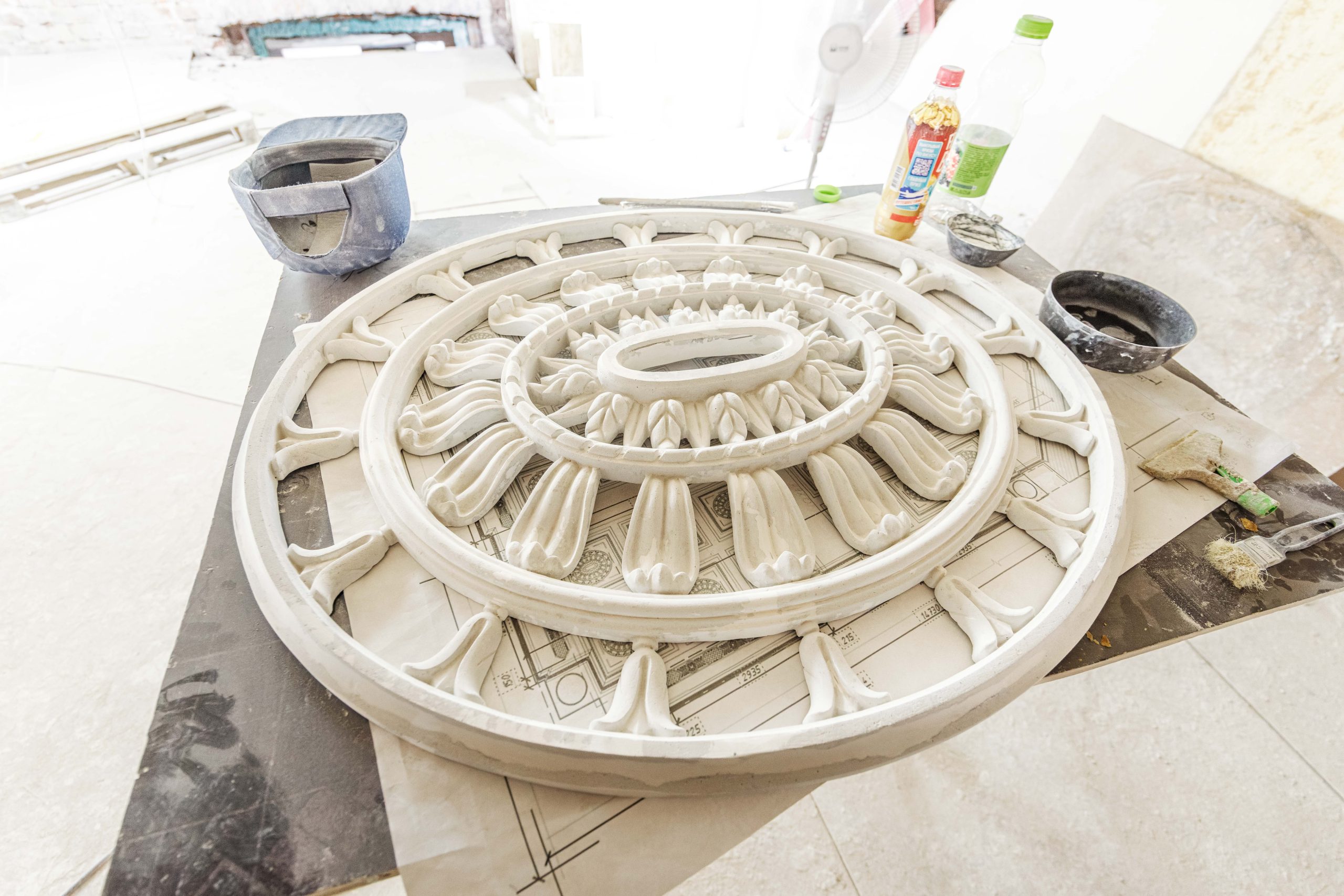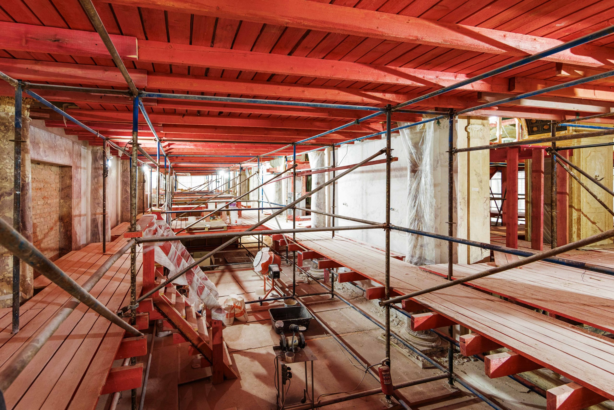На крыше завершено усиление несущих конструкций. Внутри здания восстановление стен проводится с нуля — значительная часть оригинальной штукатурки была утрачена. В отдельных помещениях реставраторы готовят поверхности к финальной отделке. Цветовые решения интерьеров подтверждаются архивными материалами и натурными исследованиями для точного совпадения с историческим обликом.