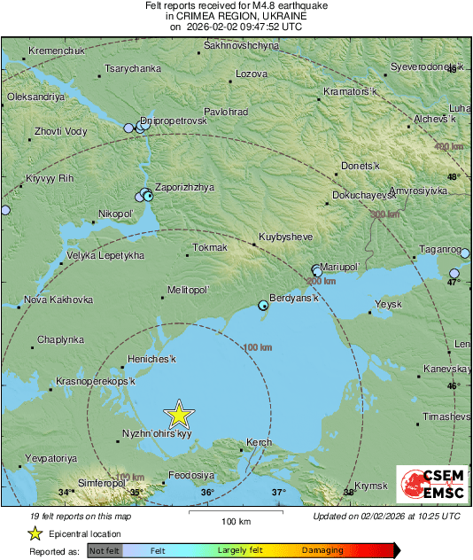 Землетрясение зафиксировали около 12:50 мск, примерно в 35 км к северо-западу от города Щелкино (Керченский полуостров). Очаг залегал на глубине 10 км, говорится на сайте центра.